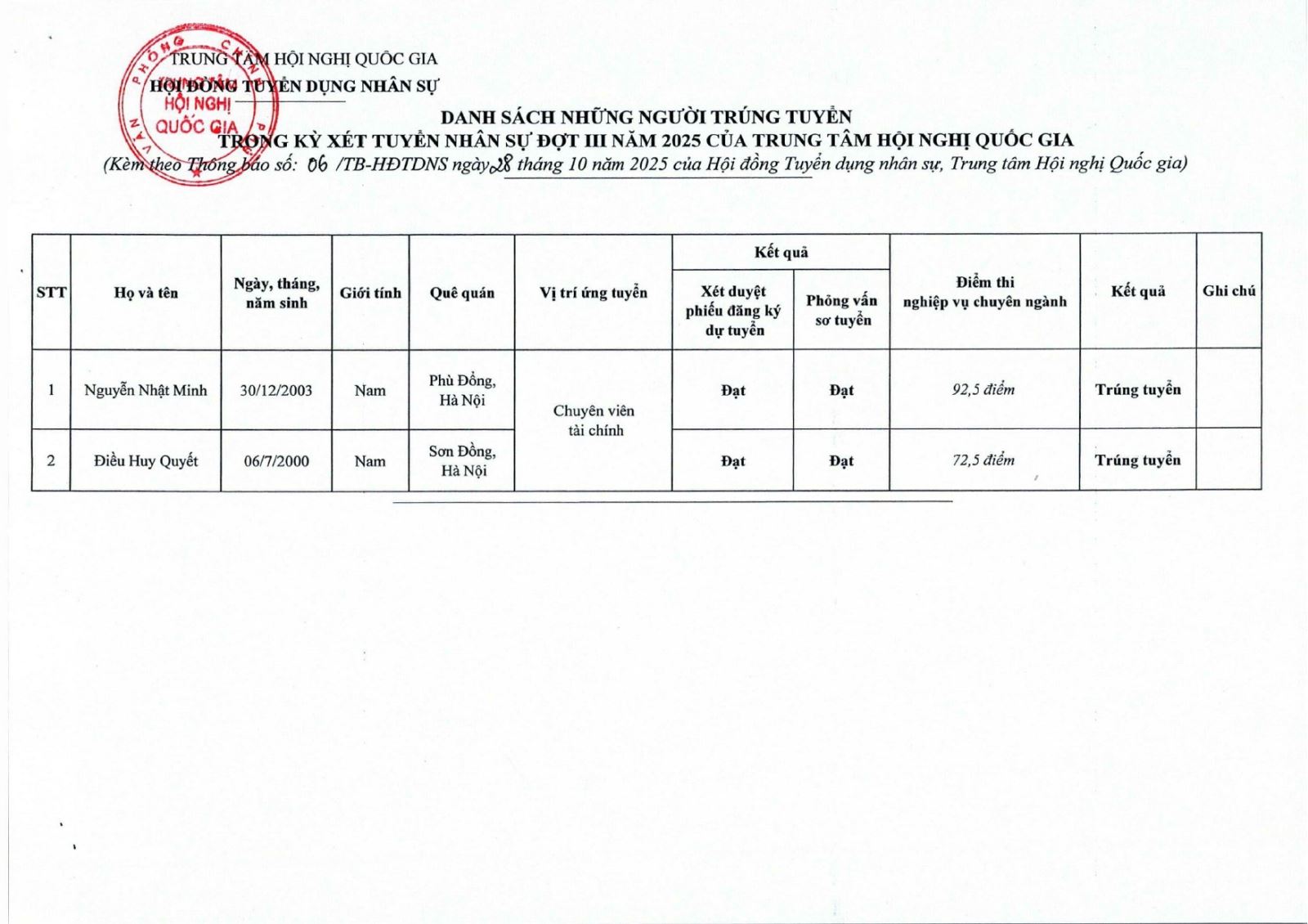 Thông báo Công nhận kết quả trúng tuyển kỳ xét tuyển nhân sự đợt III năm 2025 của Trung tâm Hội nghị Quốc gia